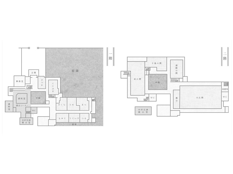 1階には、宿泊施設だったときに客室として使われていた部屋6室と、中広間、中村左洲の作品を集めた展示室と、かつて台所だった資料室などがある。
