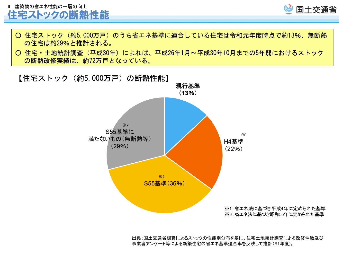 国土交通省によると、既存住宅に関しては空き家を除く住宅ストック約5,000万戸のうち、外皮性能に係る省エネ基準を満たしていないストックは87%※3を占めている。