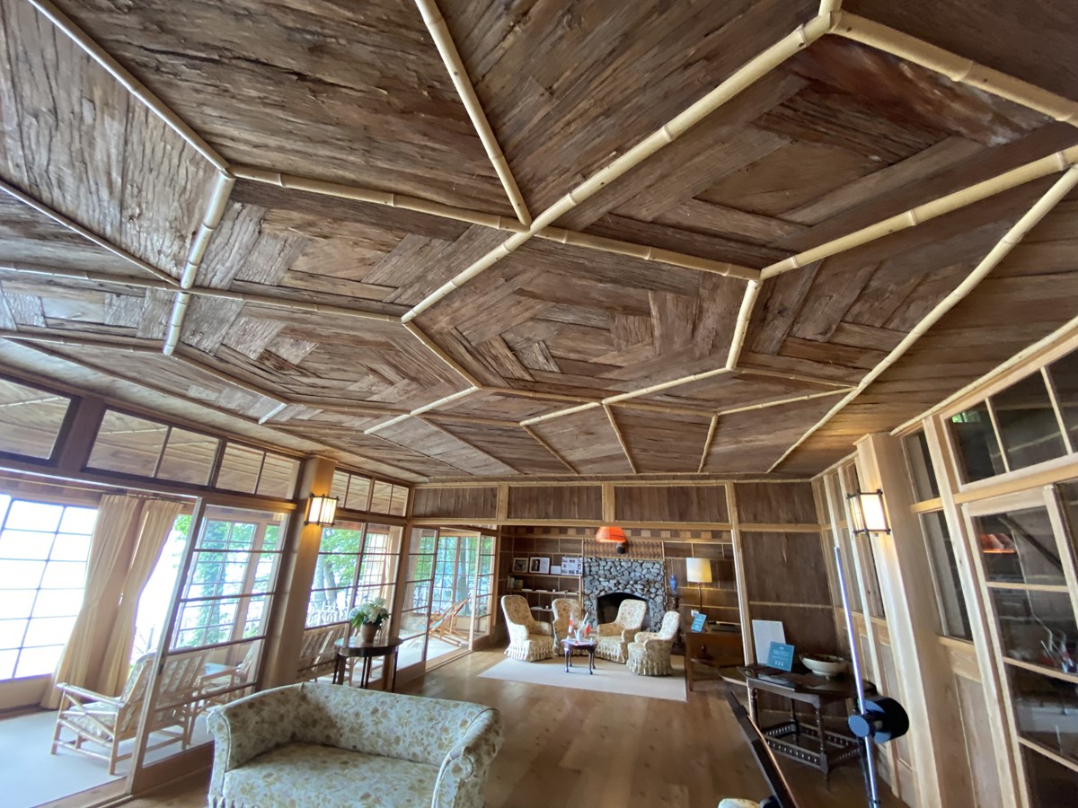 レーモンドは独立後、ライトの影響から脱するのに苦労したといわれる。横浜市に現存する「エリスマン邸」(1926年)を見ると、内部空間は確かにライトっぽい。それに対して旧イタリア大使館別荘は、「装飾重視」という意味ではライトの影響下にあるが、スギという日本的な素材をメインに据えることで、ライトとは異なる「木造モダニズム」の表現へと一歩踏み出したことが見て取れる。