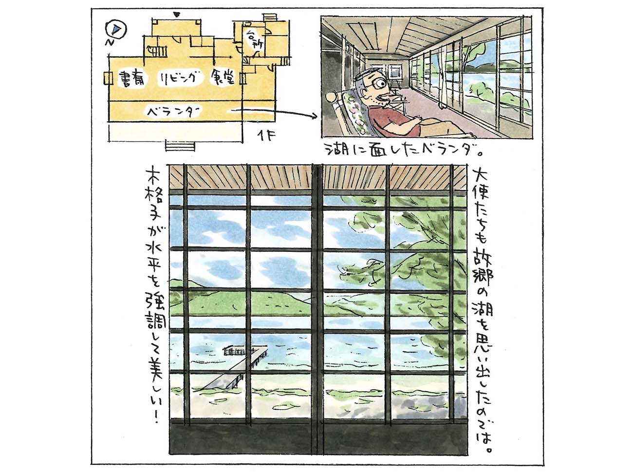 1階はリビング・ダイニングが見せ場。だが、愛を感じるのはむしろ、機能のないベランダの方だ。湖に面したベランダの椅子にゆったりと身を委ねると、ガラス戸の木格子が湖の水平ラインを強調してなんと美しいことか。暖かい日にはガラス戸を開け放ち、縁側のように外気を感じることもできる。