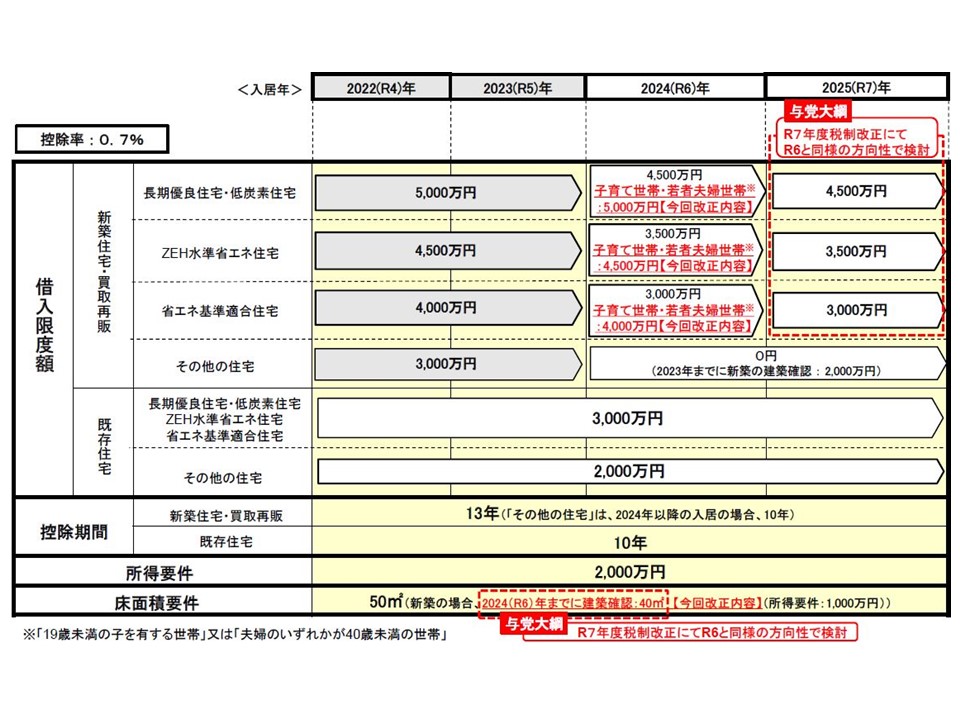 もうひとつの改正点は床面積についてだ。40m2以上50m2未満の住宅であっても、2024年12月31日までに建築確認を受ける住宅であれば適用対象となる。この場合の所得要件は1,000万円以下だ。