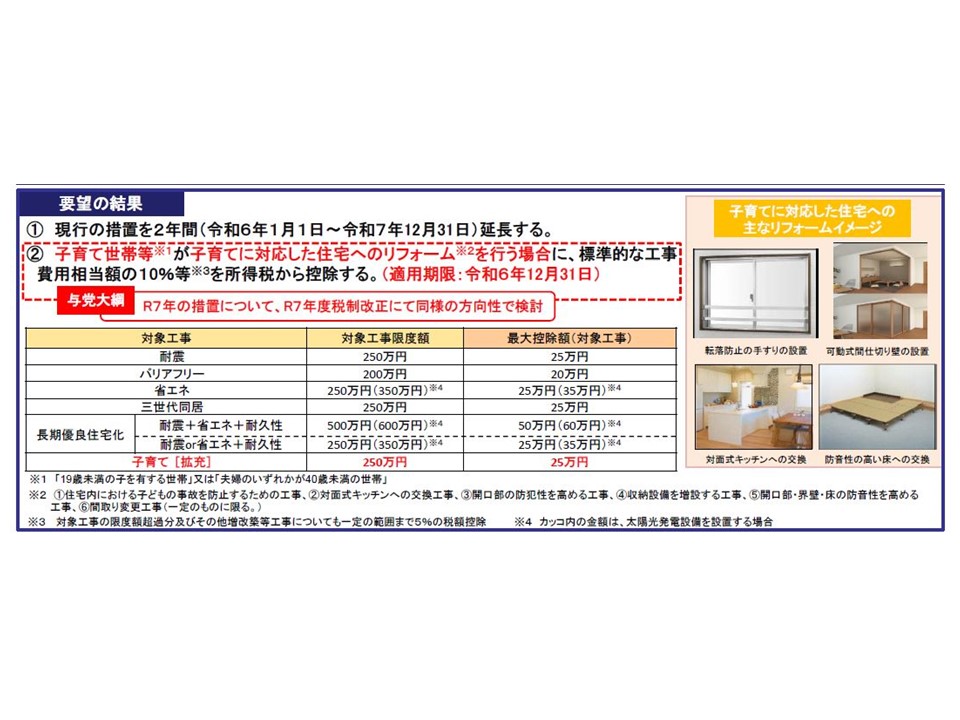 同制度の適用期限も2023年12月31日までだったが、今回の改正によって2年間(2025年12月31日まで)延長される。また、対象工事として新たに子育て世帯・若者夫婦世帯が行うリフォームも加わった。具体的には手すりの設置や対面キッチンへの交換といった子育てに対応したリフォームだ。同工事に対して最大25万円が控除される。なお、住宅ローンを利用して中古住宅を購入し、対象となるリフォームを行えば、住宅ローン減税と併用することもできる。