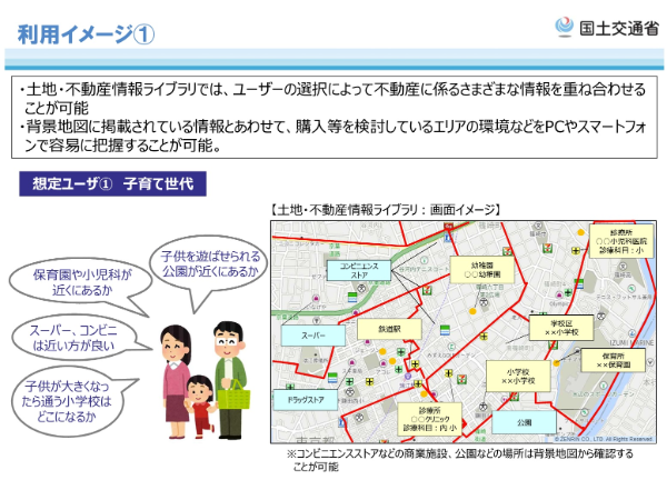 土地・不動産情報ライブラリとは、不動産の価格情報や防災情報、周辺施設情報等の不動産に関わる情報を地図上に分かりやすく表示するシステムのことである。現在、国土交通省では地価公示や都道府県地価調査の情報を地図上に表示する「土地総合情報システム」を運用しているが、このシステムを飛躍的に進化させたものが「土地・不動産情報ライブラリ」に相当することになる。