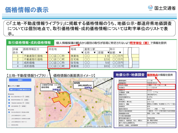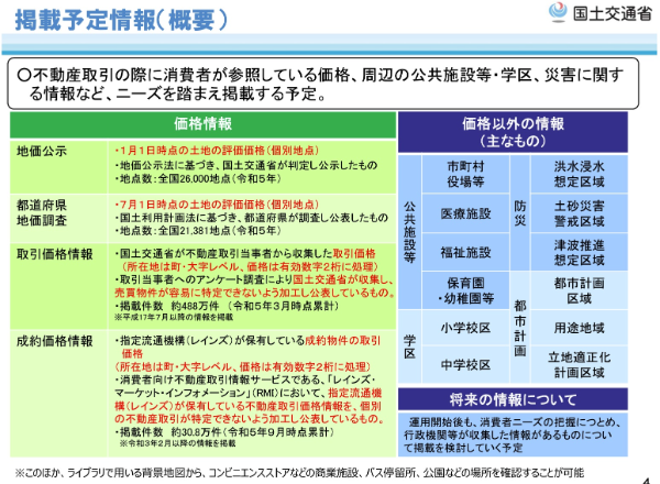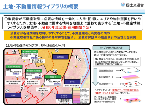 2023(令和5)年5月9日に国土交通省は土地・不動産に関する情報を地図上に分かりやすく表示する「土地・不動産情報ライブラリ」を構築することを公表している。2024(令和6)年度の公開・運用開始に向けて、2023(令和5)年度は設計・開発等を実施している。