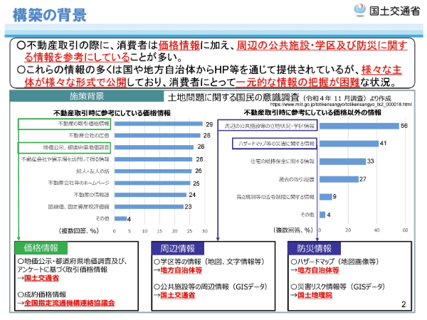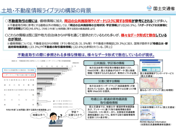 国土交通省によると、買主が不動産取引時に参考にする価格以外の情報としては、1位が「周辺の公共施設等の立地状況・学区情報」(60.5%)、2位が「ハザードマップの災害等に関する情報」(46.6%)となっている。「周辺の公共施設等の立地状況・学区情報」や「ハザードマップの災害等に関する情報」はいずれも調べれば入手可能であるが、情報が自治体や国に散逸していて調べにくい。