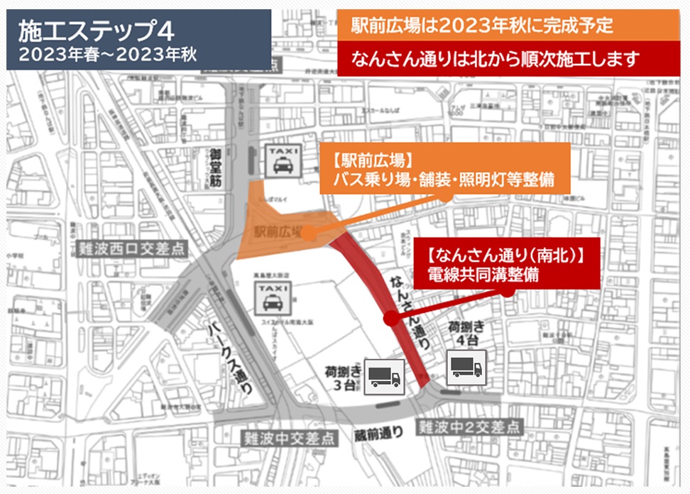 また、なんば広場から続くなんさん通りでは隣接ビルと一緒に難波千日前地区の再開発プロジェクトが始まり、将来的にはなんば広場と一体化した、より広い歩行者中心エリアになるという。