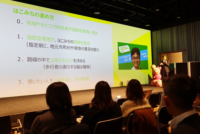 トップバッターの国土交通省道路局環境安全・防災課の井上直さんはほこみち制度の紹介役。今後、トライしてみたい人のために簡単に要点をまとめると、ほこみち制度では以下の3つのことができるようになる。