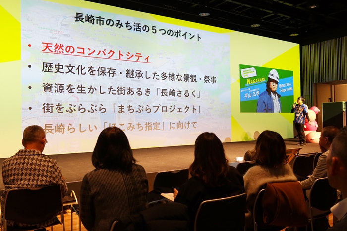 最初に登壇した長崎市のまちづくり部まちなか事業推進室の平山広孝さんは2010年に市民活動団体「長崎都市・景観研究所」を設立、まちを楽しくする活動をしつつ、2011年に長崎市に入庁、河川や景観に関わる仕事をしてきた。現在はまちなかエリアの再生に関わっている。