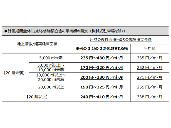 少し古いデータだが、2018年度「マンション総合調査」(国土交通省)によると、修繕積立金の積立額が計画に比べて不足しているマンションは34.8%に上る。また、株式会社さくら事務所の調査によると、2022年に竣工した分譲マンションの修繕積立金平均額は、1m2当たり177.8円だという。2017年と比べると67%の増額となっているものの、国交省が「マンションの修繕積立金に関するガイドライン」で定める目安(下図参照)からは大きく乖離している。