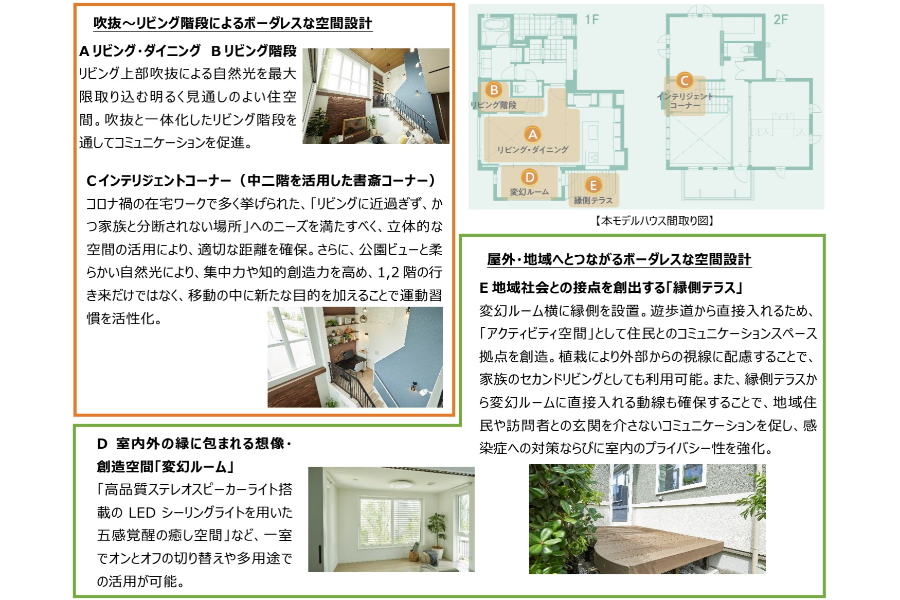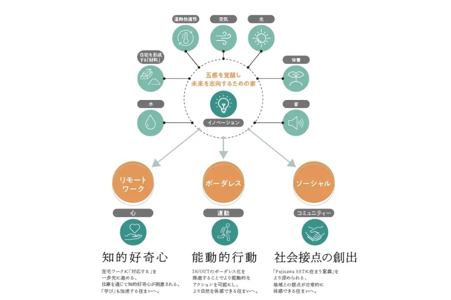 その結果、五感を覚醒し知的・社会的にポジティブに働きかける「生きるエネルギー」によって時代・社会課題を解決するための「知的好奇心」「能動的行動」「社会接点の創出」を生み出すことができる住まいの実現を目指している。