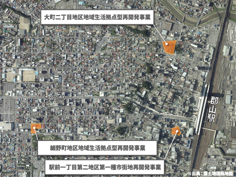郡山市内では、郡山駅前、大町及び細沼町の3ヶ所でプロジェクトが進行している。