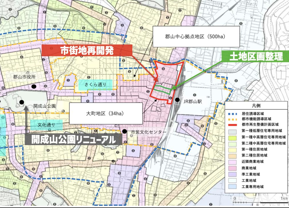 具体的には、郡山市では市街地再開発にあわせて郡山駅前で区画整理事業を実施し、新たな道路や公園などの公共施設の整備を進めている。大町地区で実施されている駅前の区画整理は大町地区の市街地再開発プロジェクトとの連携も期待できる。