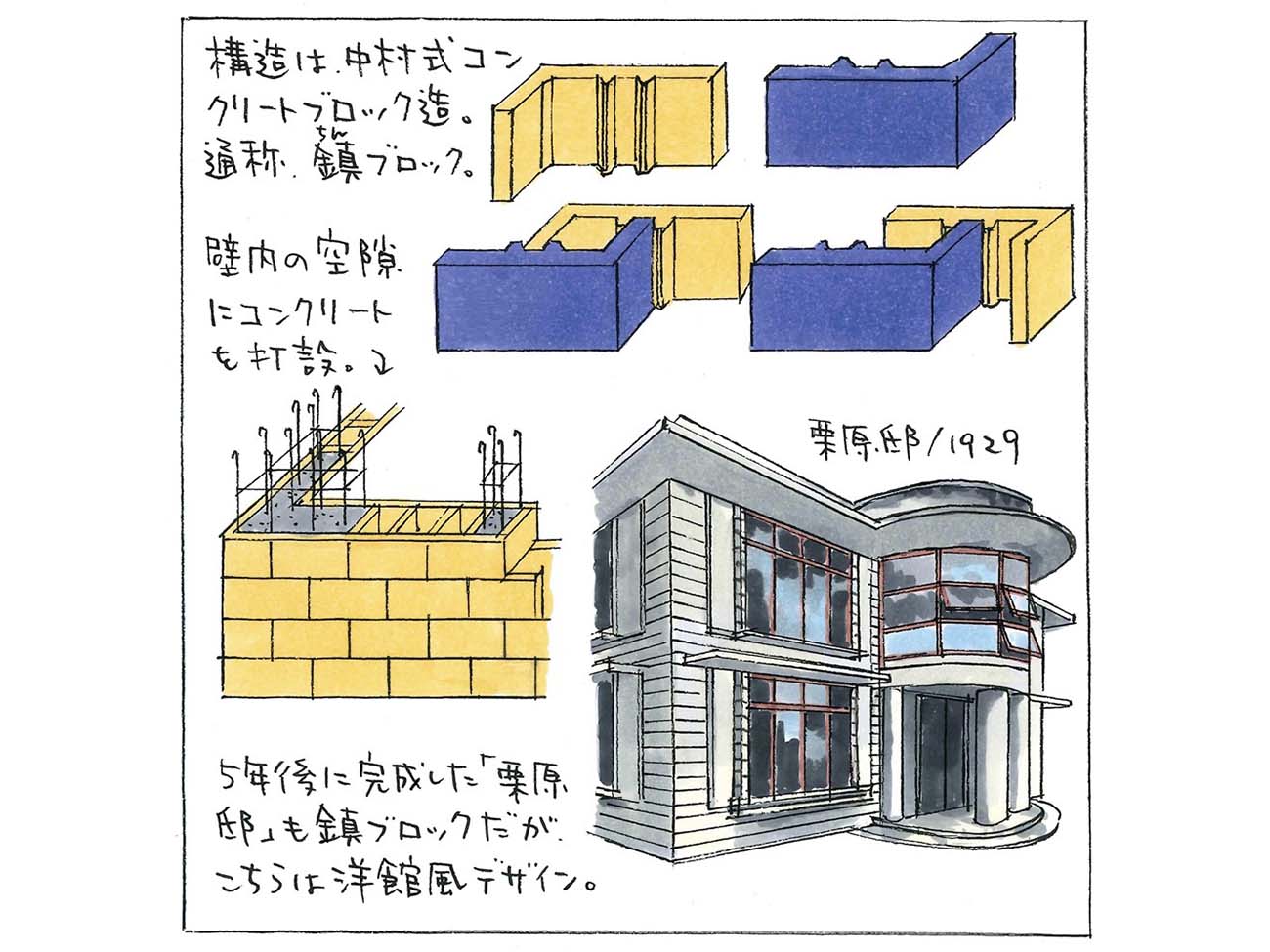 本野精吾自邸は「中村式コンクリートブロック造」という特殊なコンクリートブロック構造を用いたことで有名だ。これはL字型のブロックを組み合わせて中空の壁体をつくり、その中に部分的に鉄筋コンクリートを打設するもの。建築技師中村鎮(まもる)氏が開発した手法で、通称「鎮ブロック」と呼ばれる。