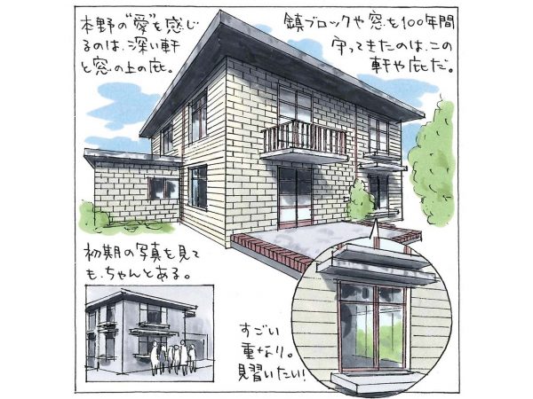 そして、この「愛の名住宅図鑑」で注目したいのは、屋根部分の深い軒だ。窓の上に飛び出す庇もいくつかある。日本の雨の多さを考慮したのだ。