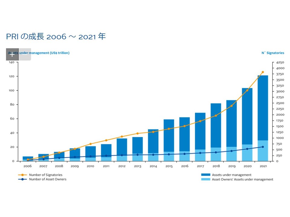 この原則に署名した投資機関は、環境、社会、企業統治に責任ある行動を宣言したことになる。署名機関の数は、2023年10月時点で5,369機関に上る。
