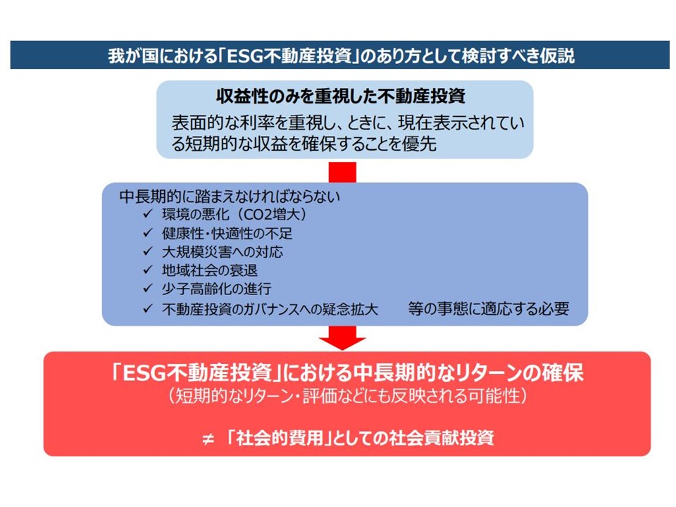 具体的には、国土交通省が「ESG不動産投資のあり方検討会」を発足し、2019年2月より検討会を重ねている。そして同年7月に次のような中間報告をまとめた(総論を一部抜粋)。