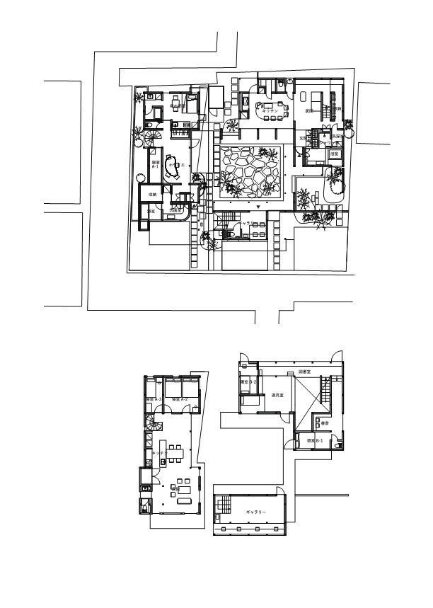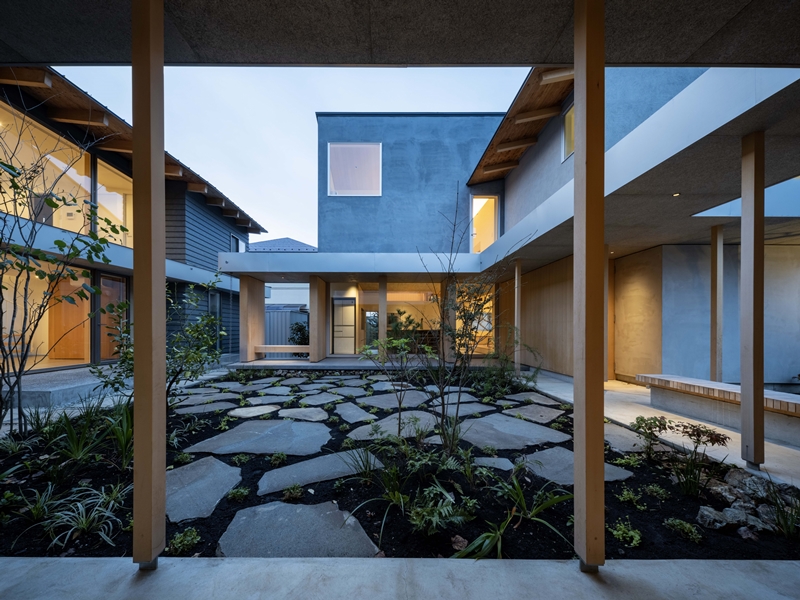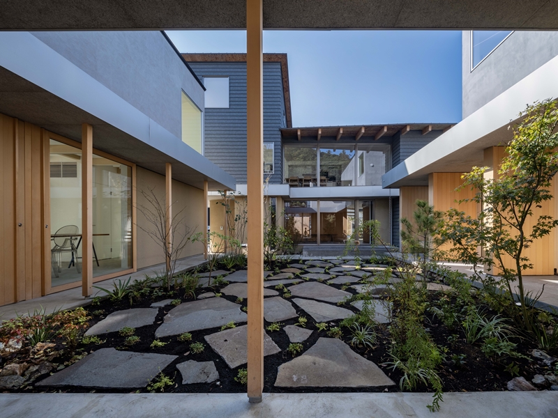実際にお邪魔してみると小松さん宅が変形のコの字型に中庭を囲むように建っており、友人宅がコの字の空いた部分を塞ぐ形。結果、2棟の建物はところどころに通路のあるロの字型になっており、中央に広い中庭が配されている。
