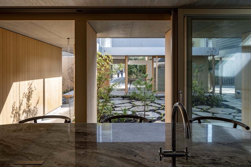 「ここの敷地は建ぺい率が60%で、土地の部分のうち40%という多くの部分が建物では使えない部分になります。そうした建ぺい率から外れた部分を共有し、ひとまとまりの大きな中庭として計画することで、1軒だけで建てた場合には使えなかった土地をうまく活かせたと考えています」