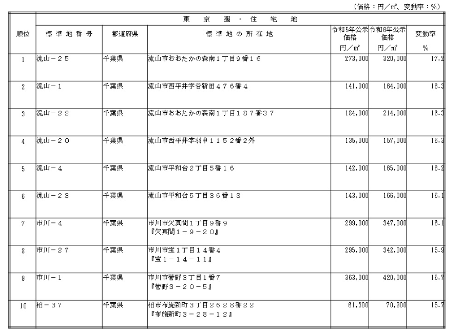 工業地も顕著な状況となっており、工業地の変動率のTOP10には、全て千葉県の標準地がランクインしている。