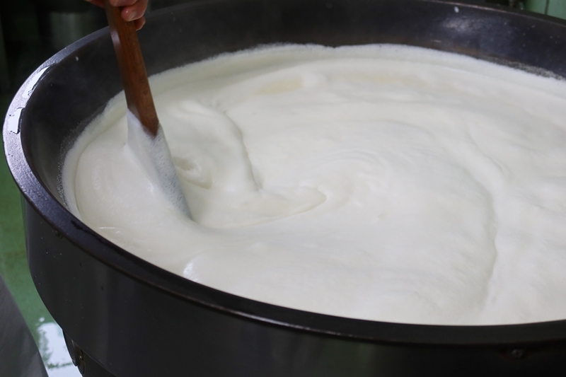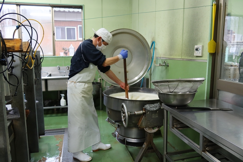 ①島根県産、山口県産の大豆を使い、真砂地区にある日晩山(ひぐらしやま)麓の伏流水を加えてすりつぶした大豆を大きな釜に入れて、ガスの直火で煮る