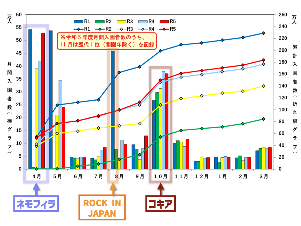 二つ目の課題は、公園閑散期の利用客減少だ。下図をご覧いただきたい。公園を管理する国営常陸海浜公園事務所によると、海浜公園の繁忙期は春と秋であり突出して訪問者が多いことが分かる。