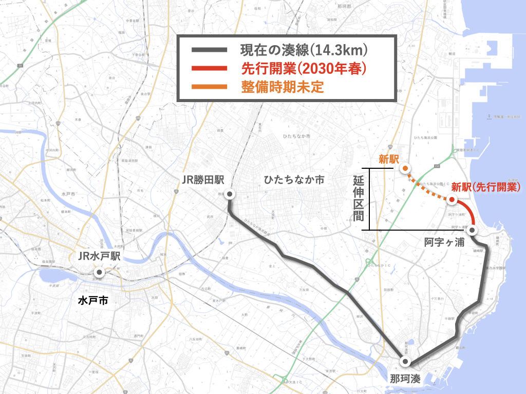 現在、このアクセスを改善する延伸計画が進んでおり、湊線を運行するひたちなか海浜鉄道株式会社では、2024年3月11日に国対し延伸にかかる工事施行の認可申請(鉄道事業法第8条第1項に基づくもので国土交通大臣の認可を受けるもの)を行ったことを発表した。