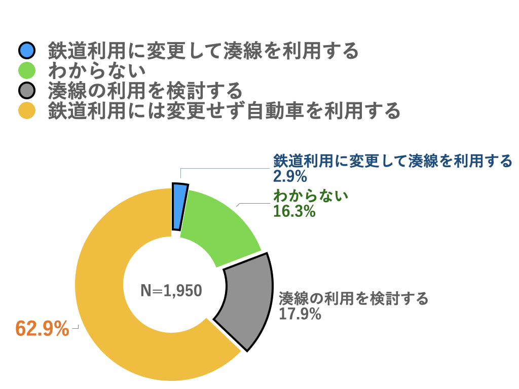 なお、過去の統計調査(下図参照)をみると、海浜公園への自家用車来訪者に対して湊線延伸後に湊線を利用するかという問いに対しては全体の21%が利用するもしくは利用を検討するとしており、こうした鉄道を想定している方に適切にアプローチすることで輸送人員を大きく伸ばすことができるかもしれない。