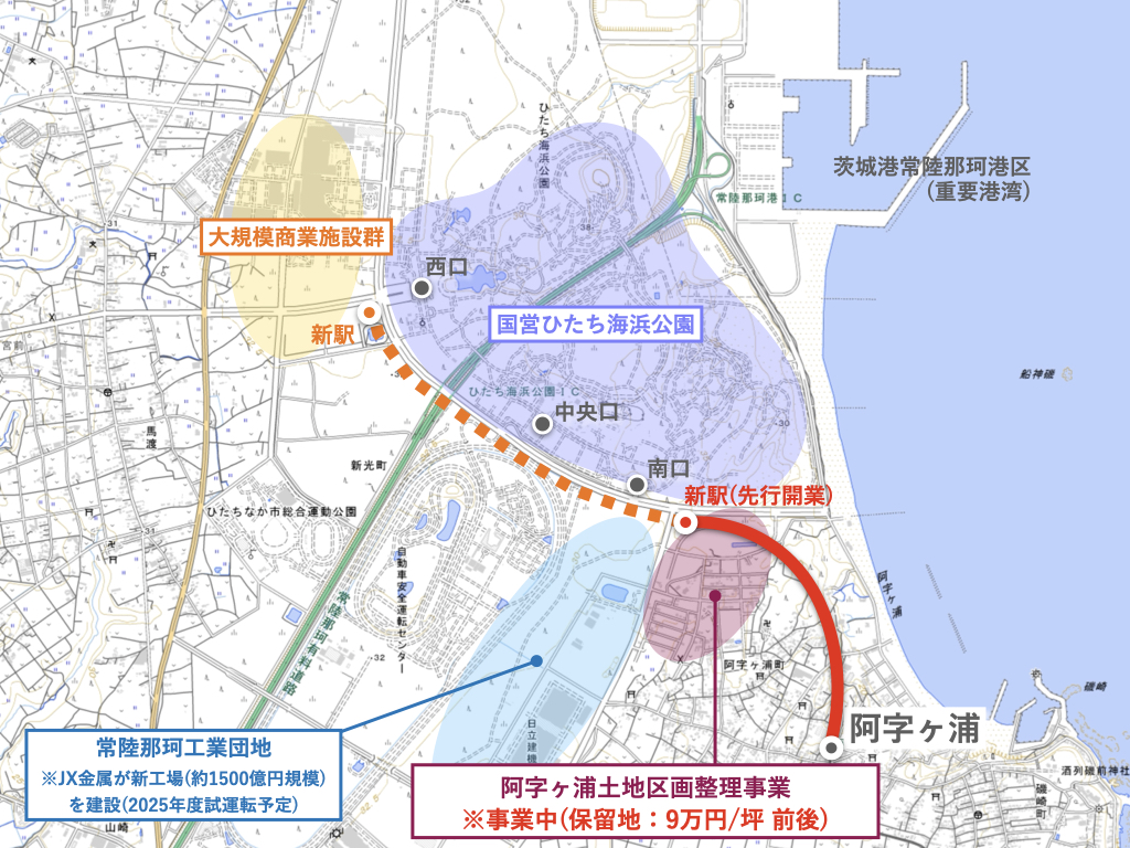 先行開業する新駅周辺には利用者が多く見込まれる海浜公園の他、JX金属が新工場建設を進めている常陸那珂工業団地、宅地整備が進められている阿字ヶ浦土地区画整理事業がある。