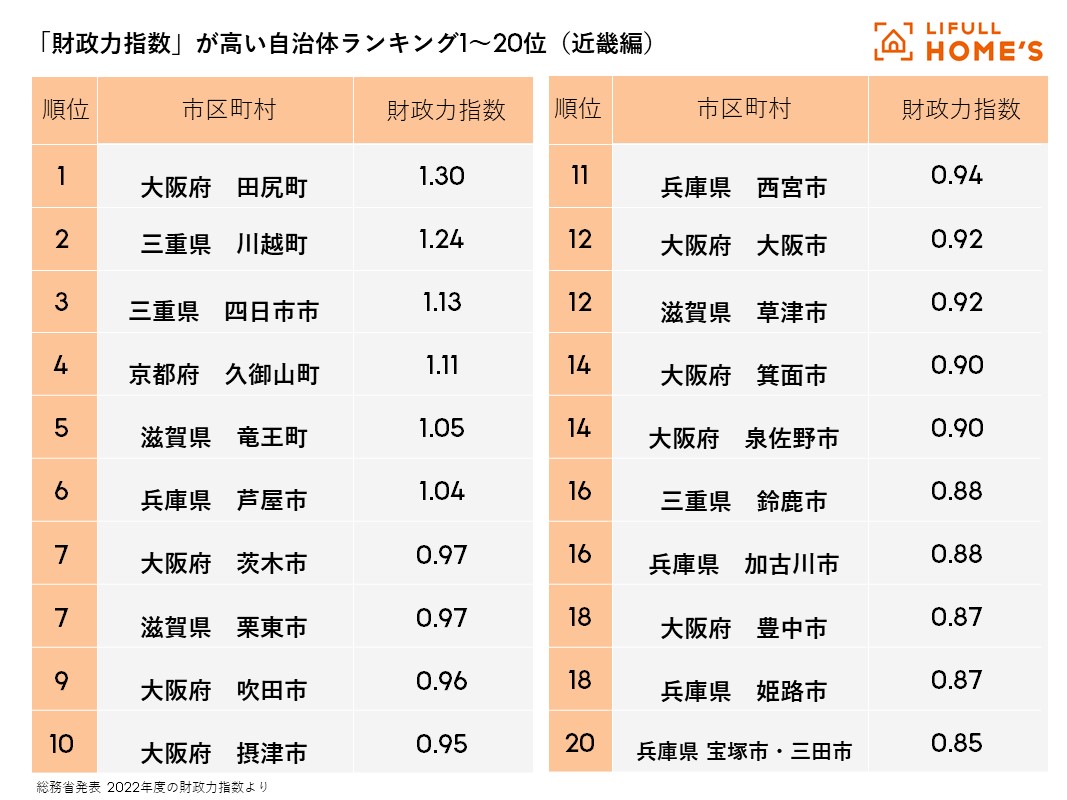 総務省が発表した2022年度(令和4年度)の財政力指数では、近畿地方の自治体の上位20は次のとおりだ。