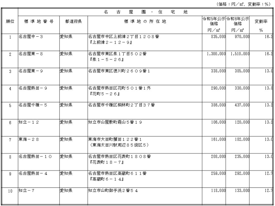 また、名古屋市の住宅地の標準地で最も上昇率が高いのは、上前津駅を最寄りとする「名古屋中-3」(愛知県名古屋市中区上前津2-12-9)である。「名古屋中-3」は、名古屋市中心部の交通利便性良好な事務所やマンションが混在する地域の中にあり、マンション適地としての需要が旺盛であることから、地価の高い上昇が継続している。2024年における「名古屋中-3」の上昇率は+16.2%となっており、昨年の+16.0%と同水準の高い上昇率が生じている。