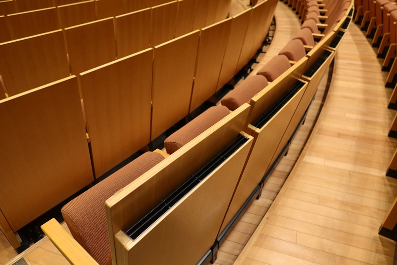 音に配慮して空調は座席の背面に配されている。全体を冷暖する大きな空調で音を出し、演奏などの邪魔にならないようにという配慮である。