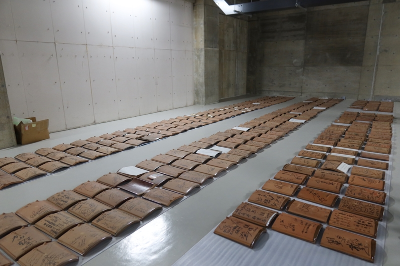 地下にはこれまであまり公開されてこなかった品も収納されていた。大ホールに出演した人たちがサインした瓦である。グラントワでは色紙代わりに瓦を使っているのだ。