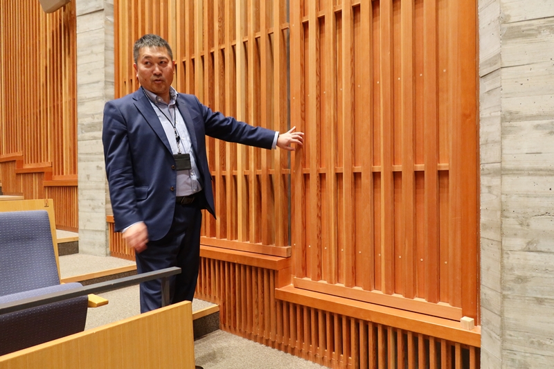 小ホールは客席数400席の木の壁が印象的な空間で縦格子になった壁面を移動させることで音響効果を変えることができるそうだ。演劇、古典芸能、映画会などで使えるほか、吊式音響反射板を使うことでこちらも室内楽、ピアノコンサートなどに適した響きを生み出せるそうだ。
