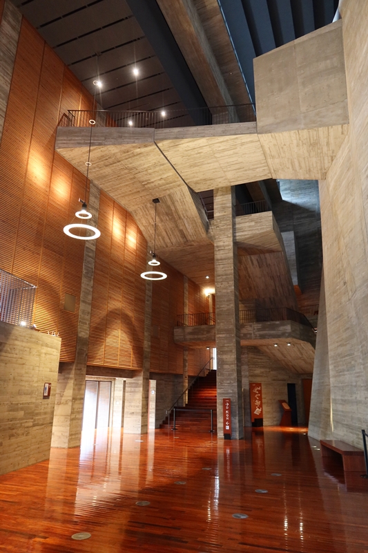 ステージに立って眺めると壁の陰影が洞窟のようで美しい。座席は千鳥に配されており、舞台と客席の距離が近いので、観客には見やすく、演者からも全員の顔が見える。気持ちよく演じたり、演奏したりできる舞台なのではなかろうか。
