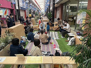 前回のOPEN NUMAZUで製作したオリジナルファニチャーや人工芝を商店街の各所に置き、アーケードの中に滞在できる場所をつくった。期間中は毎日4~6店舗が出店。それに加え、読み聞かせやストリートピアノ、将棋などのイベントも不定期で開催したそうだ。