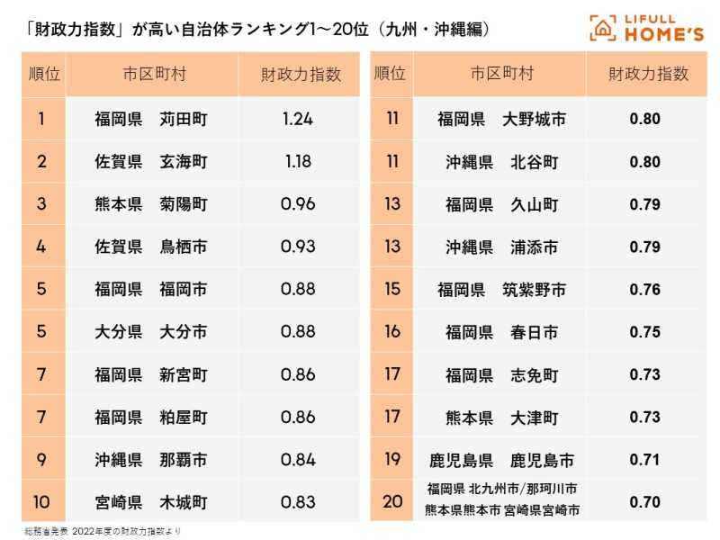 九州・沖縄地方では、どこの自治体(市町村)の財政力指数が高いのだろうか。総務省が発表した2022年度(令和4年度)の財政力指数では、九州・沖縄地方の上位20の自治体は以下のとおりになっている。
