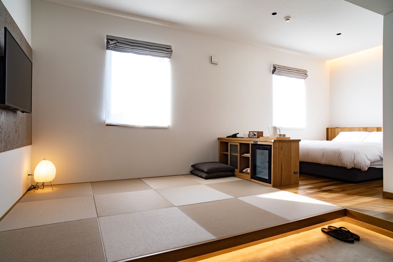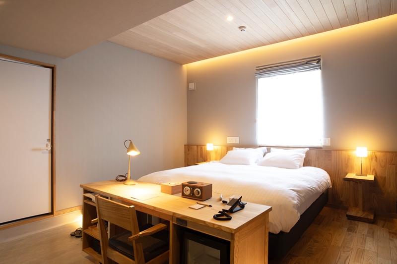 最後にホテルの紹介を。7階建て、全85室のホテルで、部屋はダブルベッドを基本にしたスタンダードタイプ、それよりも広めのスーペリアタイプの2種類があり、どちらも無垢材の床、腰壁が印象的。全室に土間もある。一部には旅館のように畳スペースのある部屋も用意されており、家族で一部屋に宿泊するといったニーズにも対応できる。