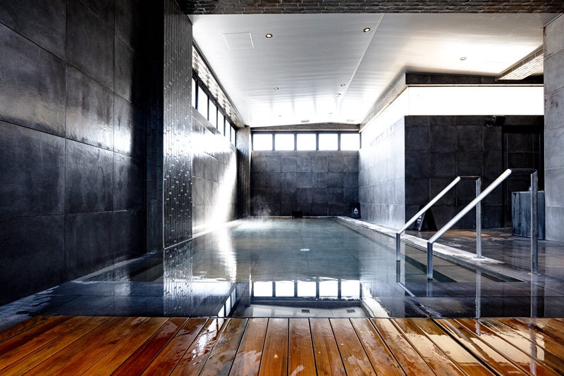 2階には益田温泉があり、男湯、女湯の間にはソファ、写真集などの置かれたスペースが配されている。浴室はプールのようにも見えるシンプルなもので、どちらにもサウナがある。全体としてモダンなリゾート地といった佇まいだ。日帰り入浴もでき、日中入浴(11時~16時59分まで)ならタオル付で1100円+消費税で利用できる。