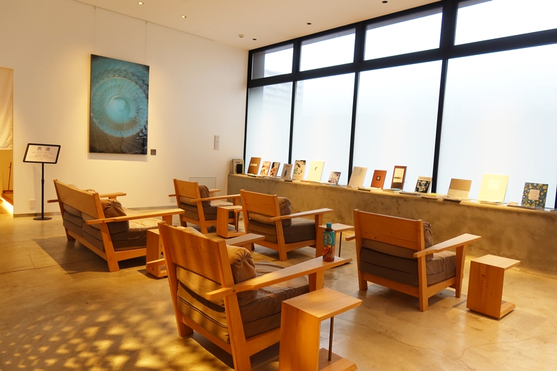 館内に置かれている机、椅子、ソファなどの家具類は江津市のdesign office SUKIMONOにデザイン、製作してもらったもの。材としては木目のはっきりした栗が多用されている。栗はタンニンを多く含んでいるため、経年とともに色が徐々に濃くなる。栗色からやがて黒褐色へ。時間の経過とともに風合いを増す材なのである。
