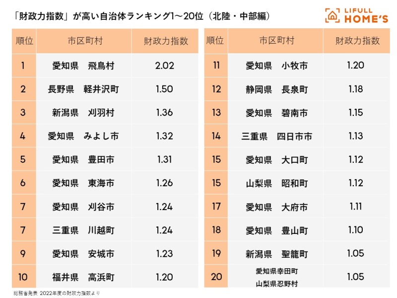総務省が発表した2022年度(令和4年度)の財政力指数では、中部地方の自治体の上位20は次のとおりだ。