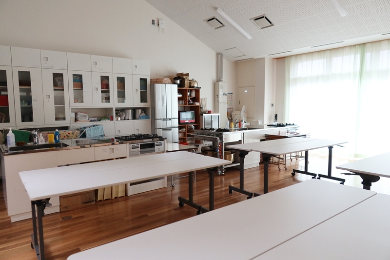 小学校と公民館は職員室と事務室が同じ空間にあるだけでなく、小学校の家庭科室兼ランチスペースは公民館の調理室を兼ねている。子ども達が使っていない時間を利用してJA女性部の人たちが地域の独居老人に配食している弁当を作るなどしており、その姿を子ども達が見学することも。そうした積み重ねで地域の子どもと大人がどんどん顔見知りになっていけば、日常や有事の際もそれが互いを守るセキュリティになる。