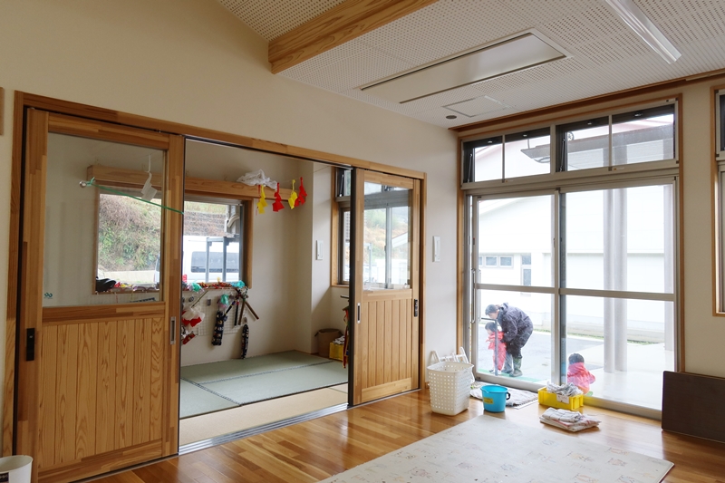 「新たに建設された建物は中央に通路を挟んでひとつの建物内に小学校、公民館の事務室があり、反対側には同様に保育所、診療所、そして別棟にそれぞれの施設が共同で使えるメディアルームがあるのですが、小学校側は市で文科省の補助金を利用、学校施設として建て、保育所、診療所はそれとは別に県の小さな拠点づくり事業から補助金を得ました」