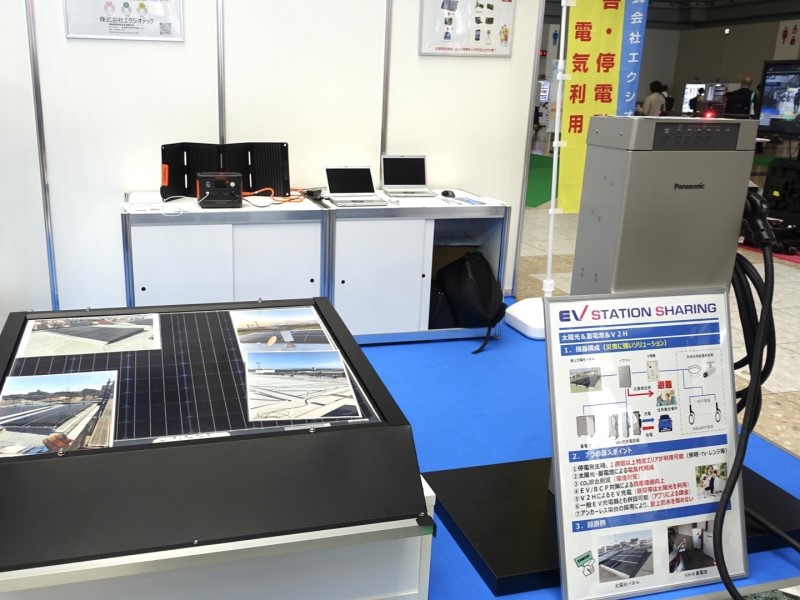株式会社エクシオテックが出展していたのは、マンションへの太陽光・蓄電池・V2H(Vehicle to Home)の導入をワンストップでサポートするサービスだ。具体的には、太陽光発電でつくったエネルギーを蓄電機にためておくことで災害時に活用することができる。また、通常は車への送電のみのEV車だが、V2Hの導入により、災害時にはEV車から住居に電力を送ることができるようになる。セットで導入することで、災害時の電力対策が強化されるだろう。
