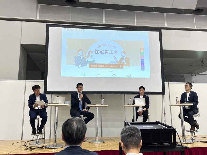 シンポジウムの様子。左からRing-ndx(株)代表取締役 蔭山貴弘氏、環境大臣政務官 参議院議員 朝日健太郎氏、(株)LEALIAN代表取締役 佐藤俊氏、Ring-ndx(株)戸部素尚氏。Ring-ndx(株)はマンション管理のコンサルティングを、(株)LEALIAN小型バッテリーのシェアリングモデルを基にした電カネットワークの構築を手がけている