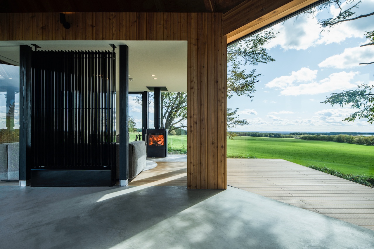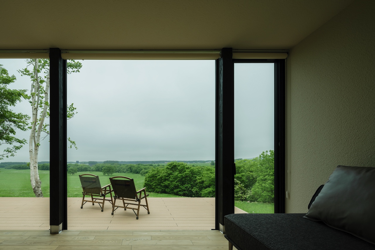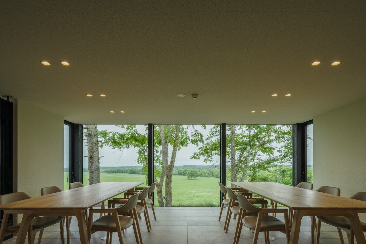 どこにいても、大きな窓から広大な竹下牧場の牧草地、そしてその先にさらに広大な根釧台地が広がり、ゲストは常に北海道の大地に包まれるように過ごすことになる。