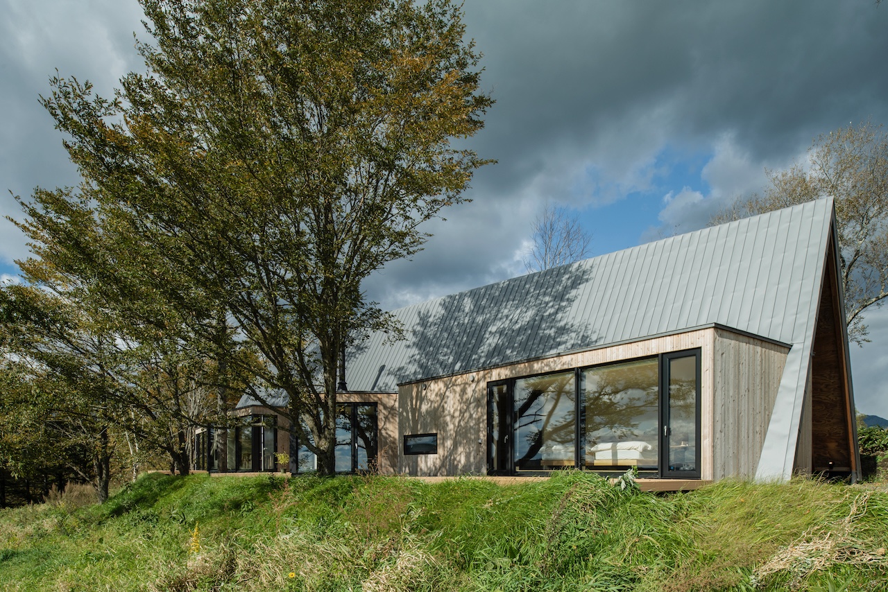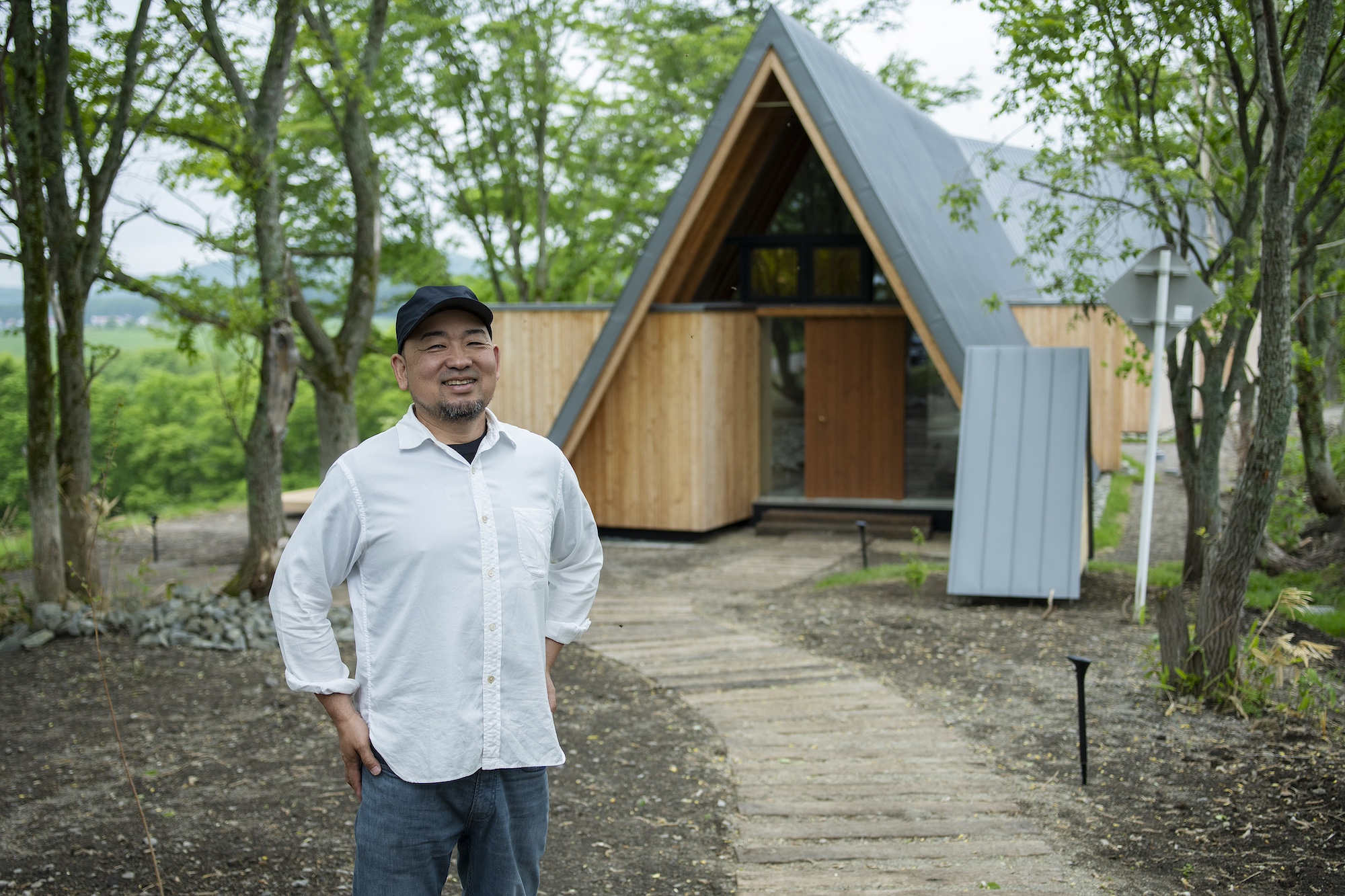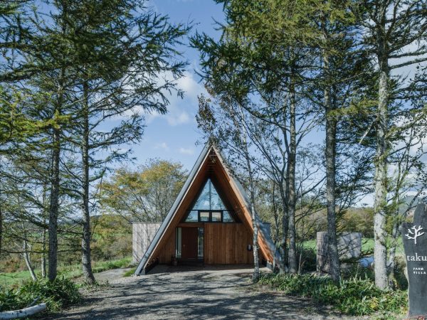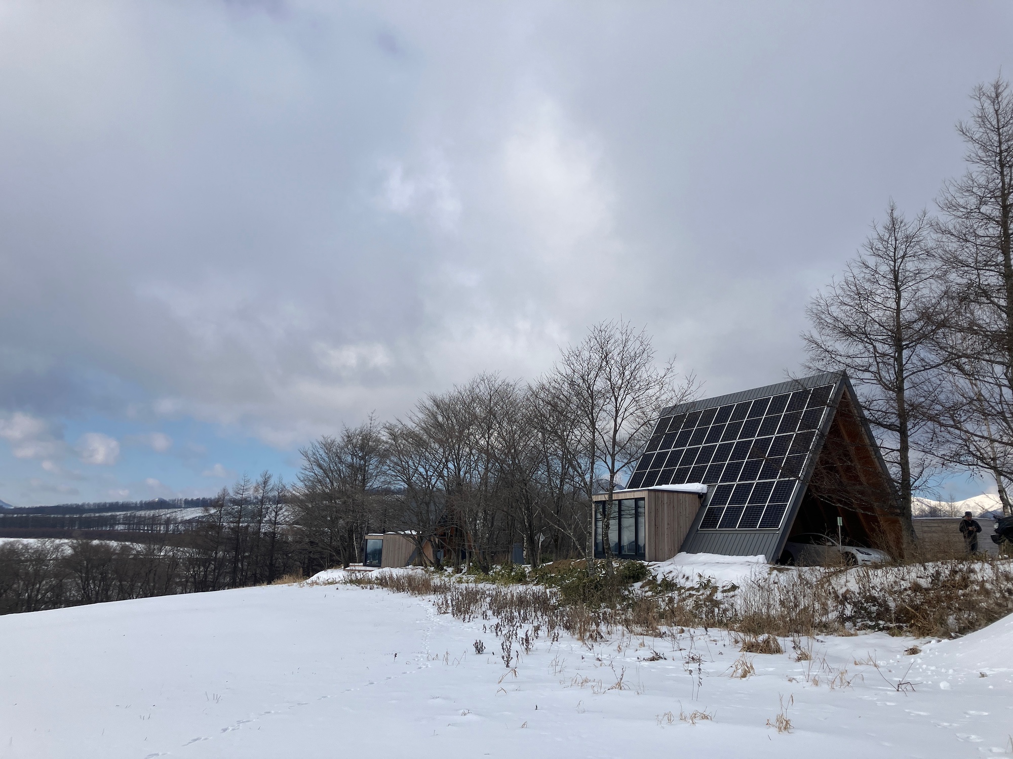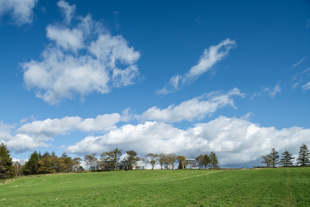 中標津町を横切る幹線道路から脇道に折れ、広大な牧草地を横目に数分車を走らせていく。すると、高台に木々が列状に並び、静謐な空気が漂う中に、瀟洒な三角形の建物「FARM VILLA taku」が現れる。オフグリッドなので当然なのだが、周囲に電柱や電線は見当たらず、「taku」は一帯の景観に全く違和感なく溶け込んでいる。
