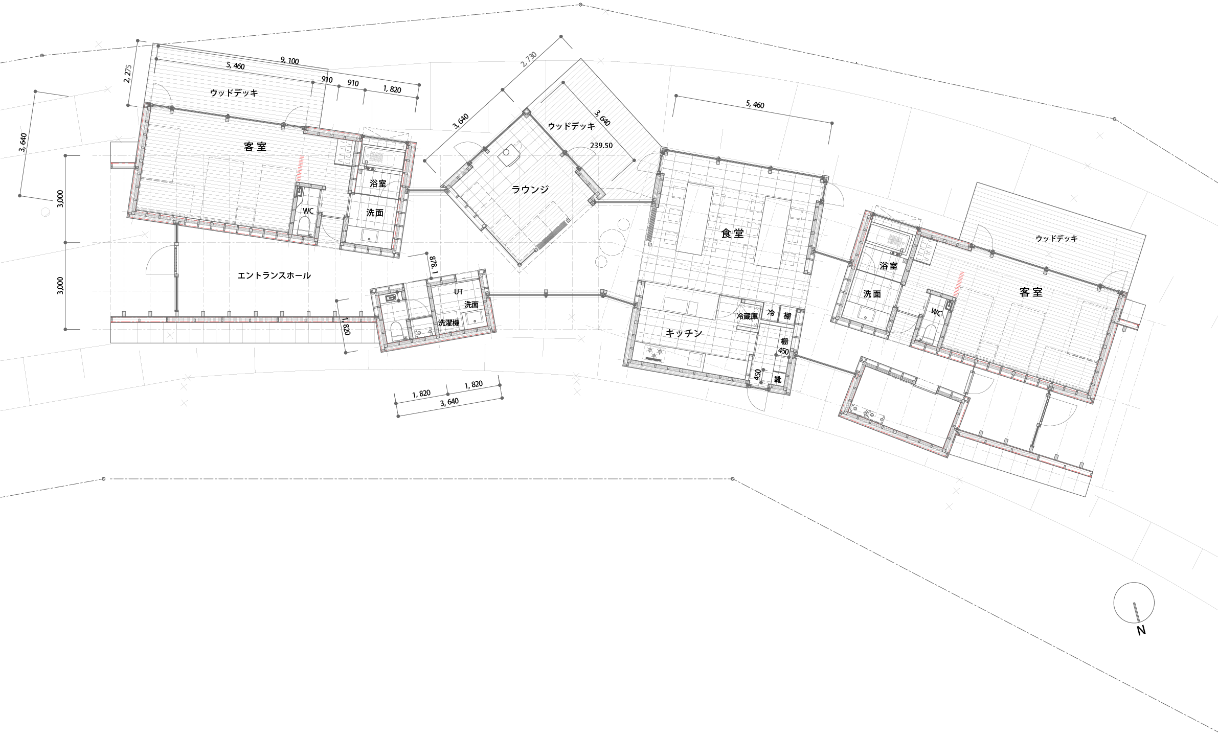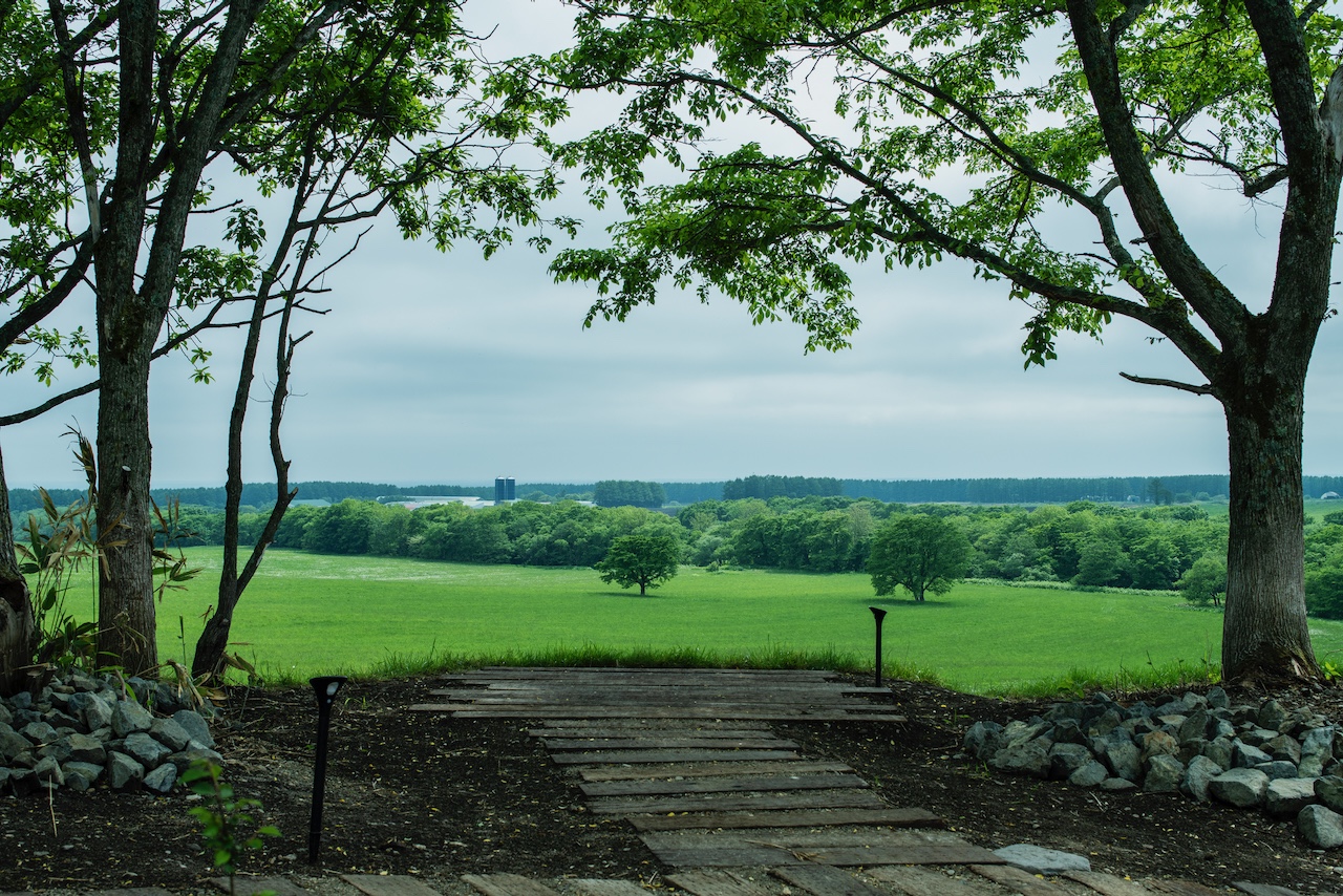 「taku」が立つ土地は、元は竹下牧場の牧草地を横切る使われていない道路(雑種地)で、木が茂って小径と呼ぶのが似合うような場所だった。小径からは、竹下さんがとても気に入っている牧草地のシンボルのような二本の木を見下ろすことができる。この場所に立って、竹下さんはヴィラのイメージを固めていったのである。「いつの日か、ここに迎賓館みたいなゲストハウスを建てて、人を呼びたいと思っていたんです。ここは開拓を表現するのに一番いい場所だと思っていましたから」