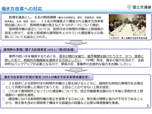これらの法律を遵守していくには、元請・下請間における適正工期の確保等の合意を実現しつつ、技能者の労働時間短縮や適正賃金の確保等を実現していく必要がある。建設業界の人手不足問題を解消するには、技能者確保に向けて魅力ある働きやすい工事現場を構築し、作業効率を高めることによって生産性の向上を達成しなければならない。