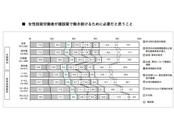 アンケート調査結果では、若年技能者が定着しない理由に「技能・技術の習得に時間がかかる」「年齢の近い先輩が少ない」等が挙がっている。昔ながらの先輩の技を盗み見て覚えさせる指導や、若年層とベテランの意思疎通が希薄な状態では今の若者はついて来ないということだ。