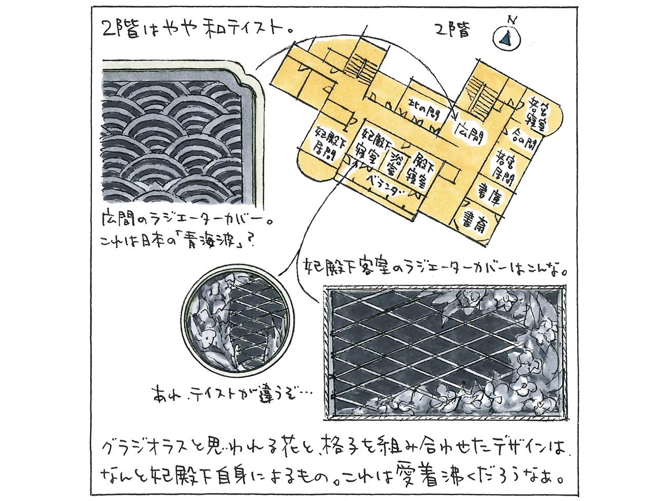 これはパリ滞在中にイヴァン=レオン=アレクサンドル・ブランショから絵を学んだ允子妃のデザイン画を元にしたものだ。もちろん、うまいのだが、ラパンが現場でチェックしていたらどう言ったかはわからない。